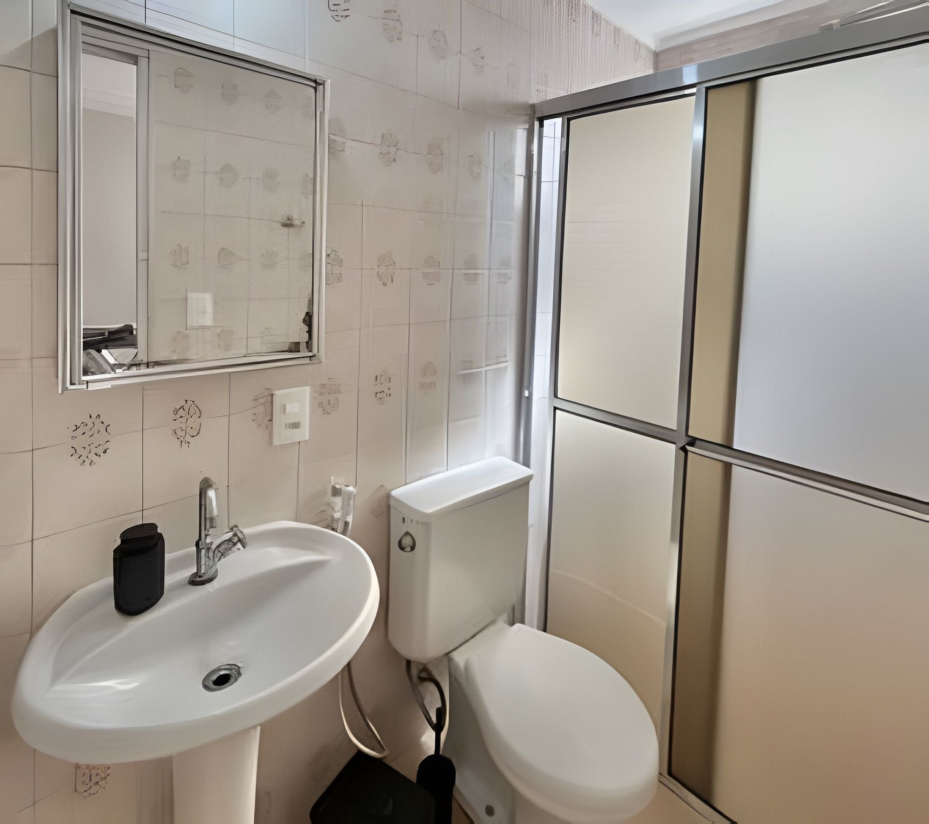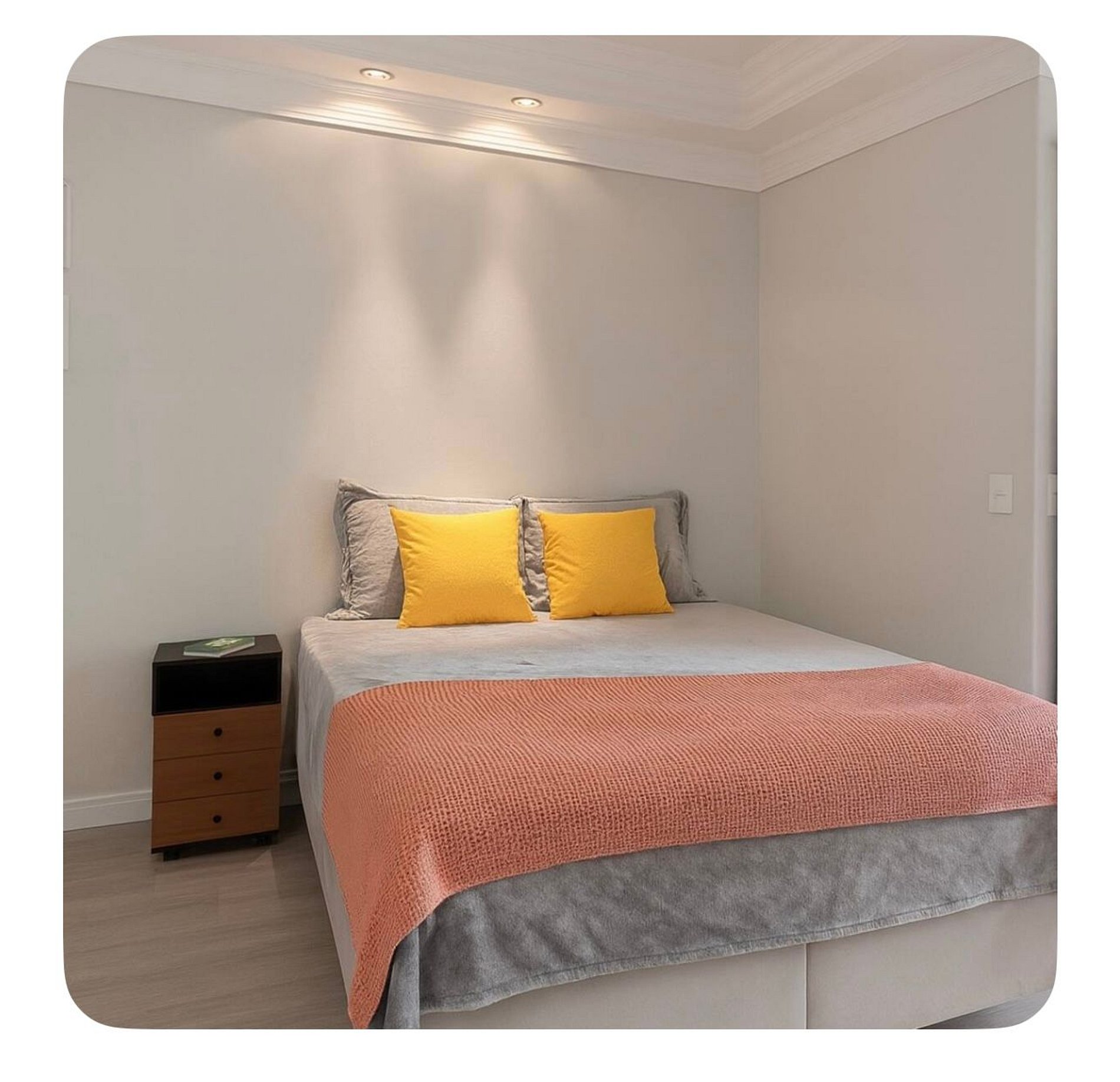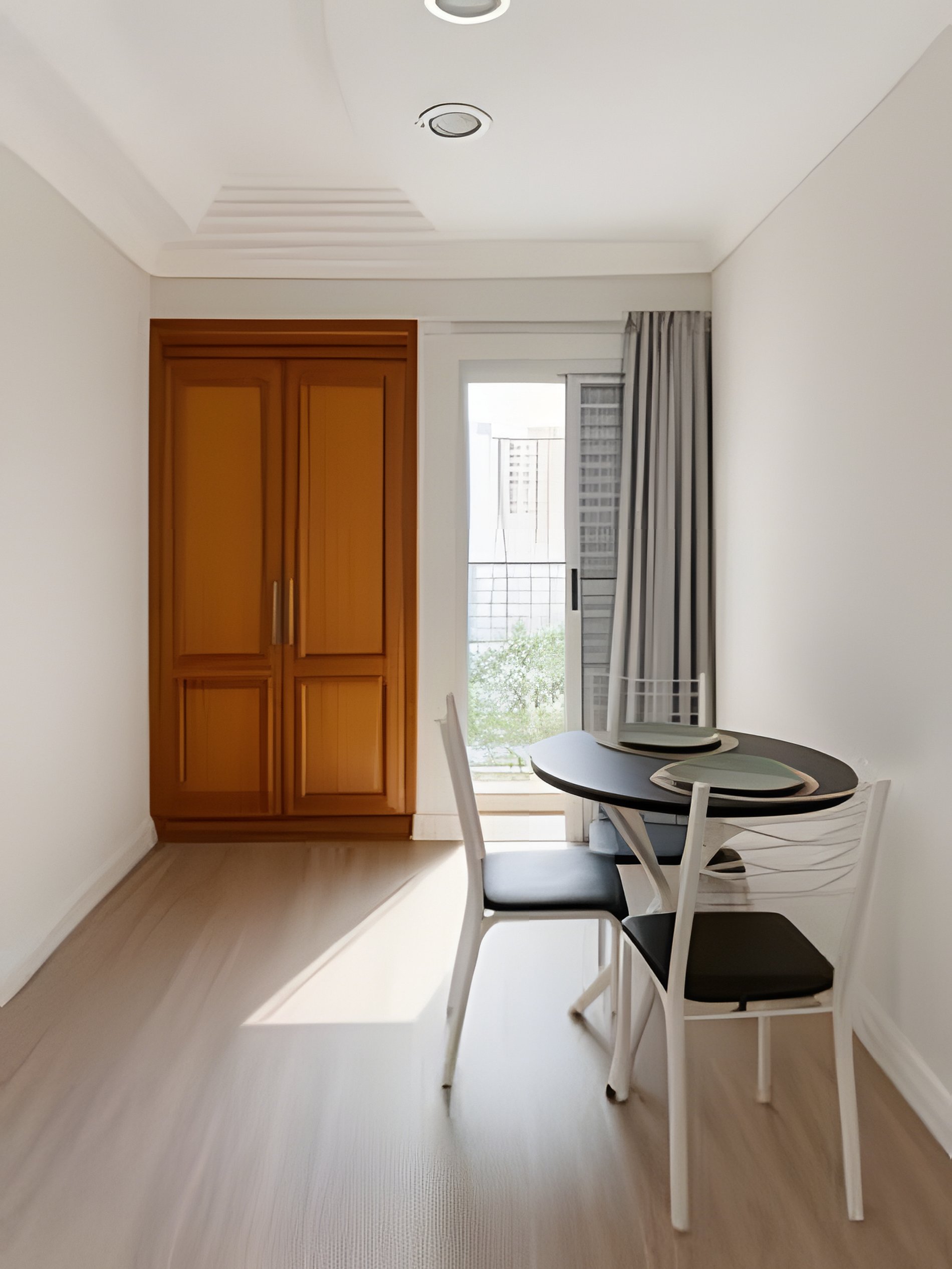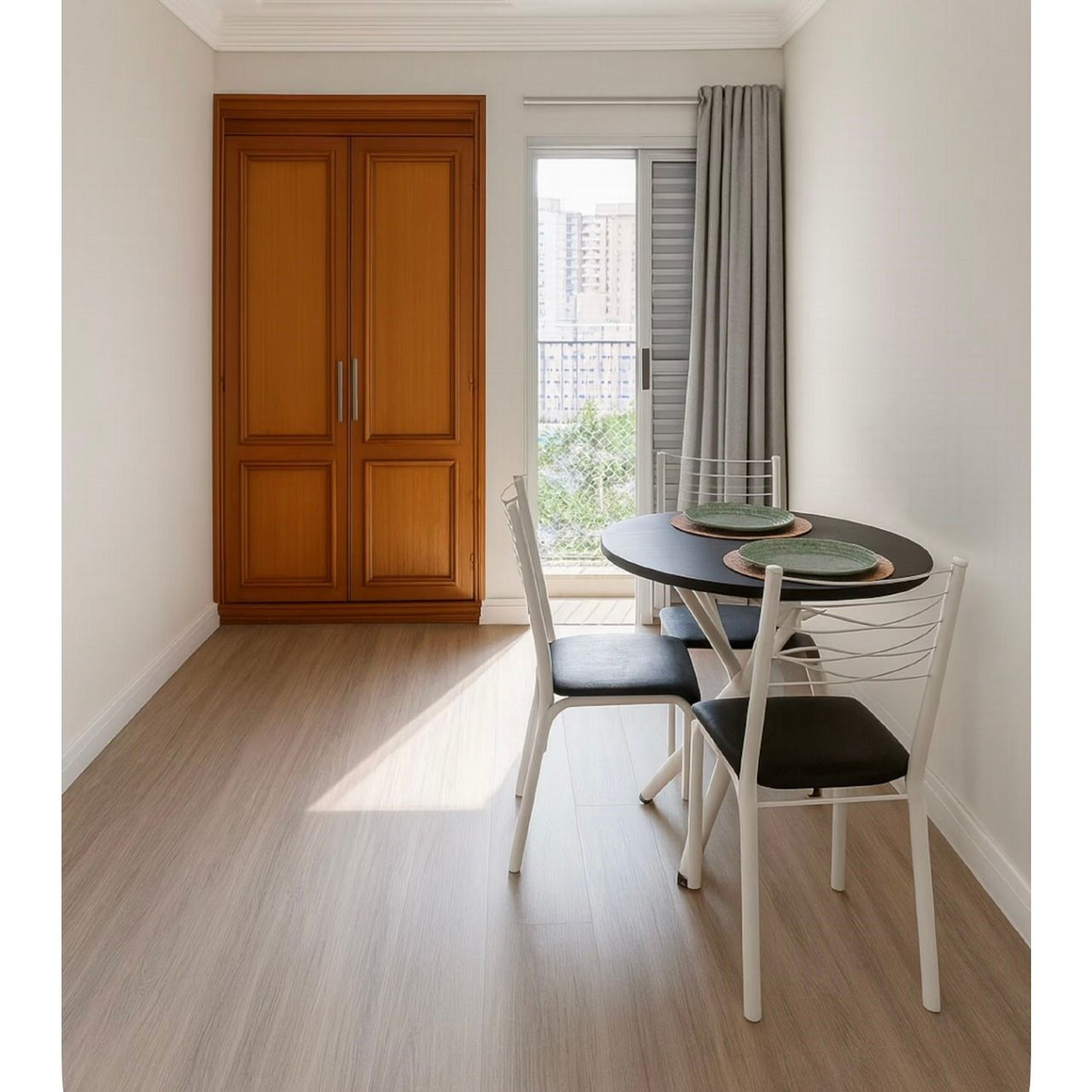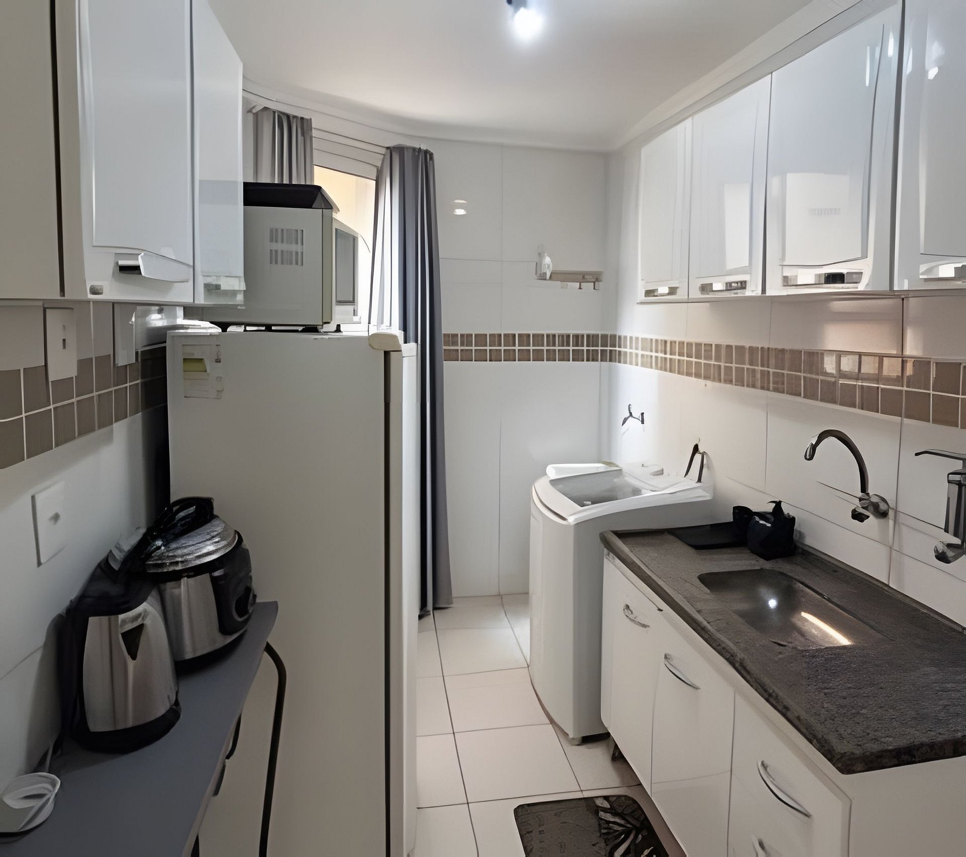 O ambiente possui sala e quarto integrados, cozinha, lavanderia, um banheiro e uma pequena sacada.